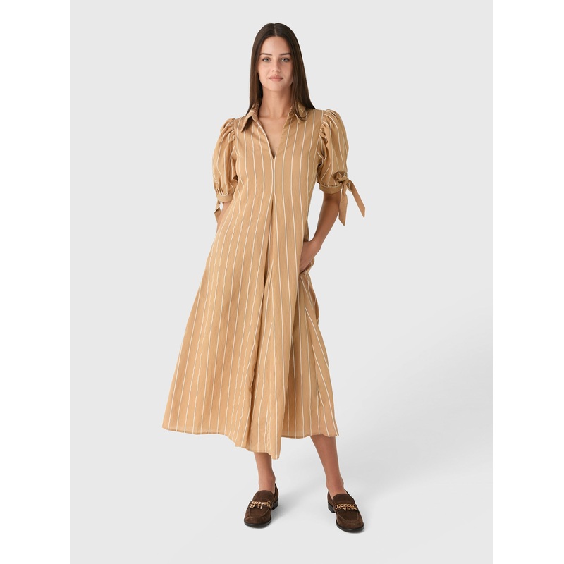DESCRIPTION:This long dress features a loose, comfortable design with puff sleeves, self-tie cuffs, and a front pleated detail.FEATURES:Spread CollarV-NecklinePuff SleevesSelf-Tie CuffsPleated FrontLong SilhouetteAll-Over Stripe Print90% Polyester, 10% Ray