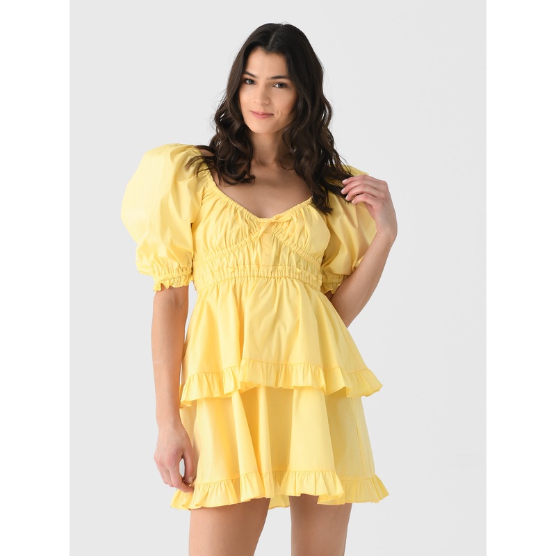 DESCRIPTION:This vibrant mini dress is made from lightweight cotton and features puff sleeves, a tiered skirt, and ruffle trims.FEATURES:V-NecklinePuff SleevesGathered BodiceTiered SkirtRuffle TrimsMini Silhouette97% Cotton, 3% PolyesterClassic FitModel is