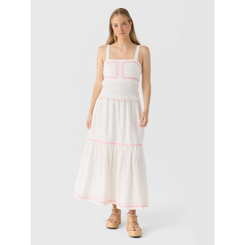DESCRIPTION:Effortless and breezy, this maxi dress is ideal for laid-back summer days. Made from a lightweight cotton-linen blend, it features a smocked waist for a flattering fit and a flowing tiered skirt. Delicate ric-rac details lend a hint of vintage