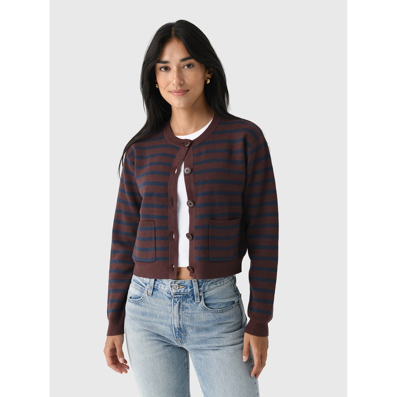 This sweater features a bold striped pattern and a cropped silhouette for a contemporary fit. With a button closure and two front patch pockets, this comfortable and stylish cardigan is a perfect layering piece.