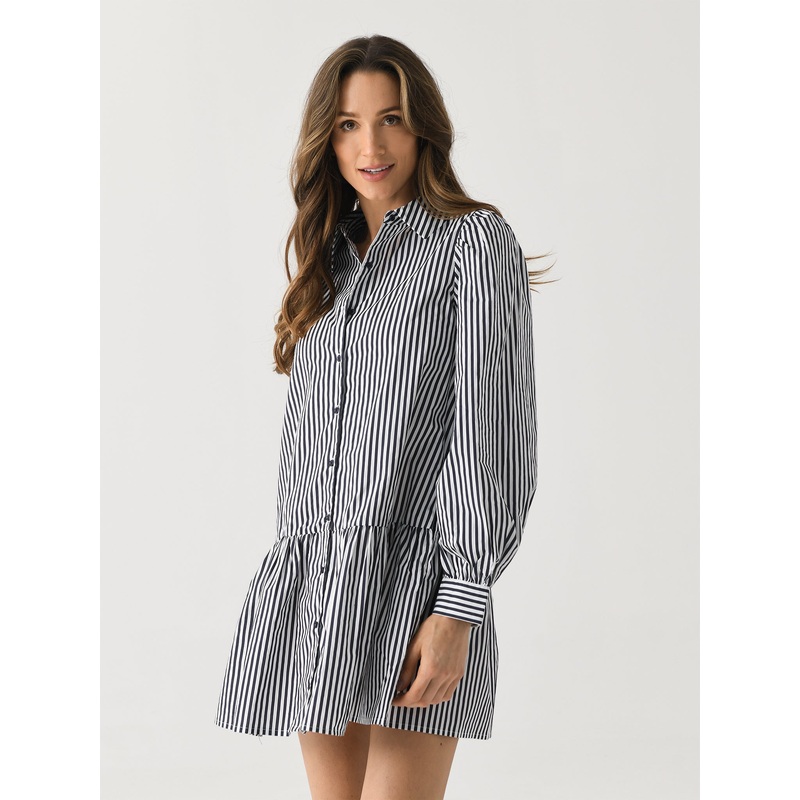 DESCRIPTION:A navy and white striped dress with feminine puff sleeves and a versatile design that can be dressed up or down.FEATURES:Spread CollarPuff SleevesButton CuffsButton-Down FrontFlounce HemMini SilhouetteAll-Over Stripe Print100% CottonClassic Fit