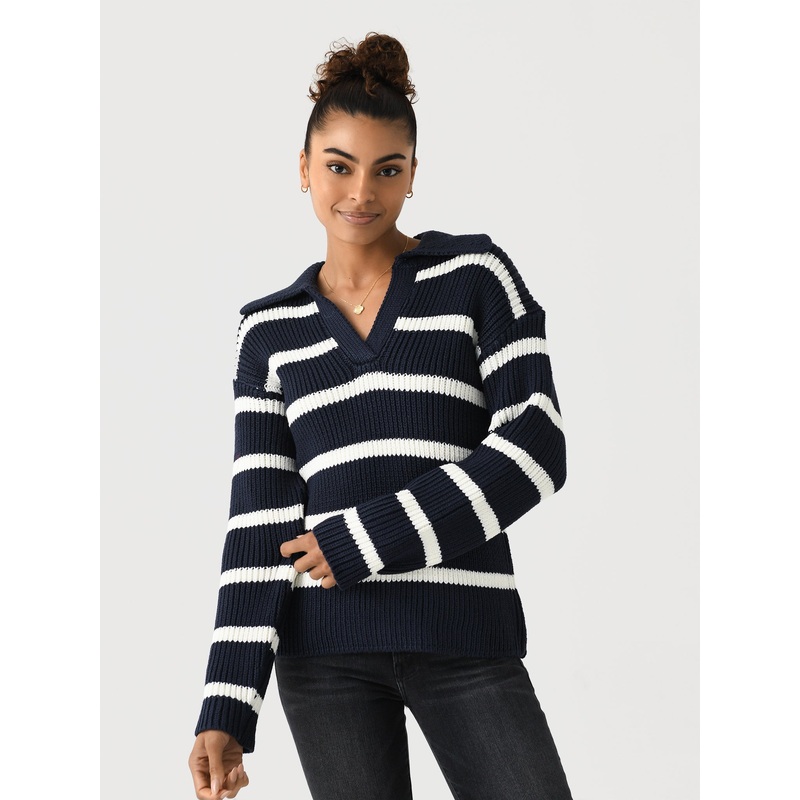 Polo-style sweater made from a cozy shaker stitch construction with a classic striped design.