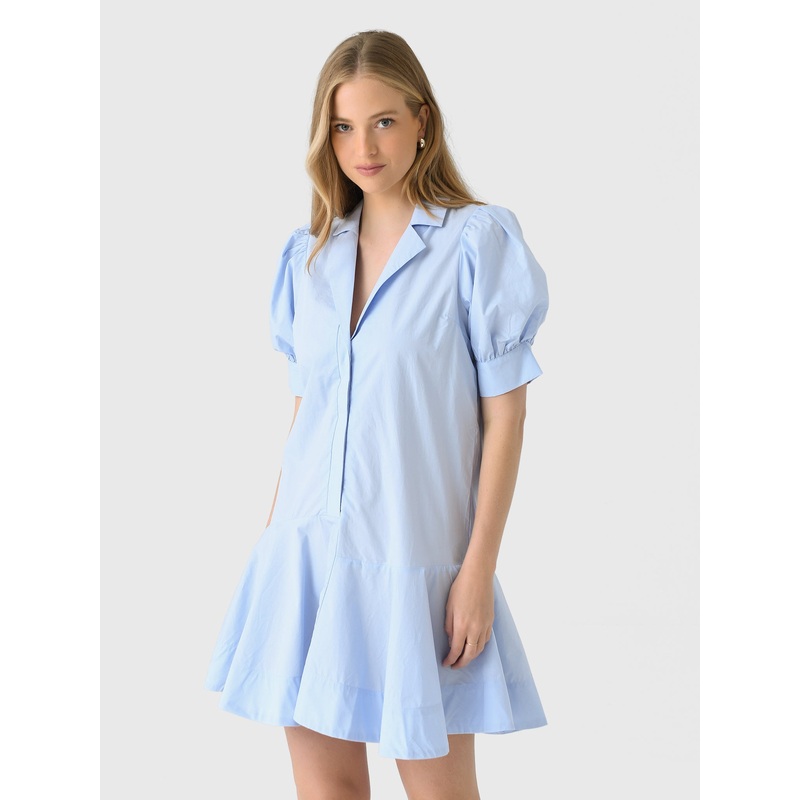 DESCRIPTION:A lightweight shirt-style dress featuring a notch collar, puff sleeves, a partial hidden placket, and a feminine flounce hem.FEATURES:Notch CollarPuff SleevesPartial Button PlacketFlounce HemMini SilhouetteLightweight FabricationClassic FitMode
