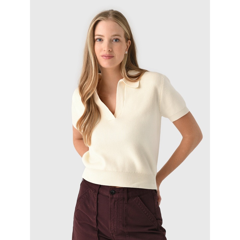 DESCRIPTION:This polo-style sweater is crafted from a cozy ribbed knit and features short sleeves and a slightly cropped silhouette for a chic, modern look. Effortlessly versatile, its perfect for dressing up or down year-round.FEATURES:Spread CollarV-Neck