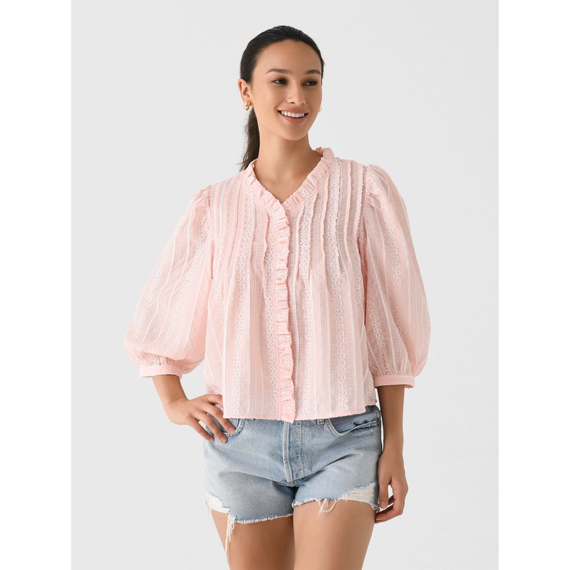 A flowy blouse with puff sleeves, stitched detailing, and ruffled trims with a relaxed silhouette.