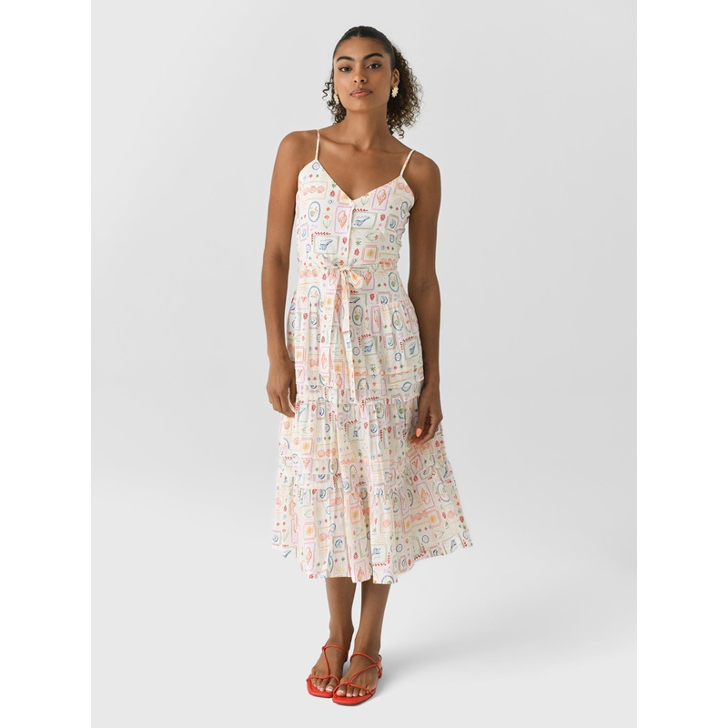 DESCRIPTION:Lightweight and full of charm, this cotton dress features a flattering V-neckline with delicate, thin straps and a self-tie belt to create a feminine shape. The tiered skirt adds soft movement and a touch of whimsy, while the coastal-inspired p