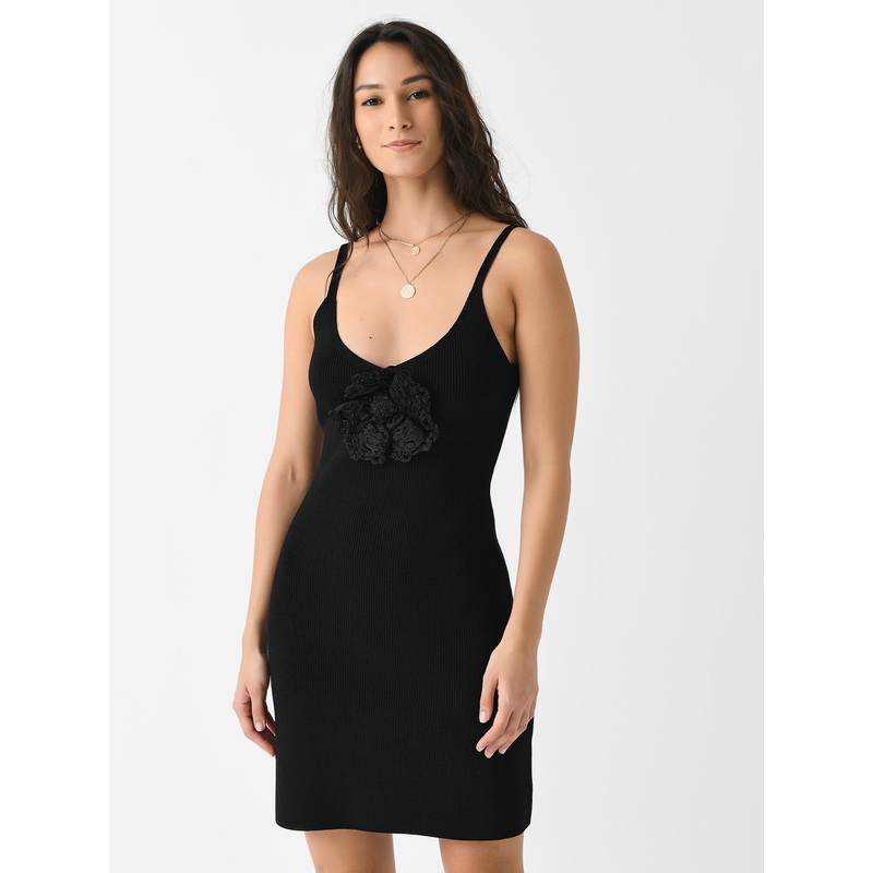 DESCRIPTION:A charming knit mini dress with a floral corsage detail.FEATURES:V-NecklineFloral Corsage DetailThin, Fixed StrapsMini SilhouetteKnit Fabrication63% Rayon, 37% NylonClassic FitModel is wearing size XS/S dress.Model's Measurements: Height: 5'9"