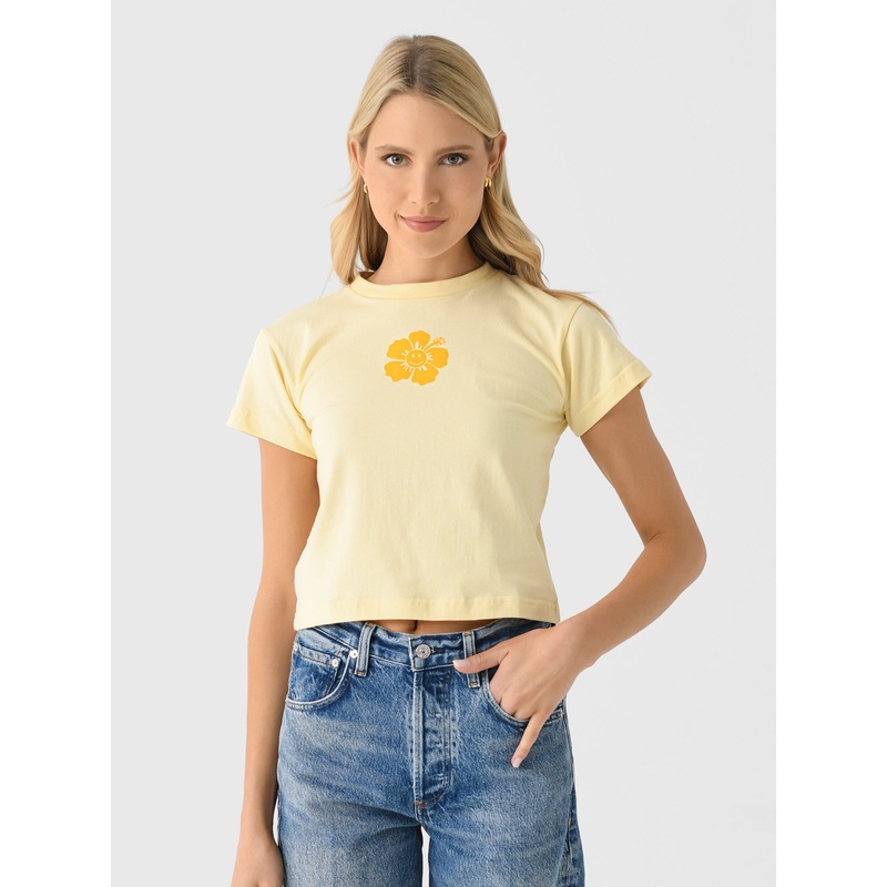 DESCRIPTION:A soft jersey baby tee featuring a smiley face hibiscus flower graphic.FEATURES:Crew NecklineShort SleevesFront GraphicCropped Silhouette100% Organic CottonSlim FitModel is wearing size Small tee.Model's Measurements: Height: 5'10.5" | Bust: 32