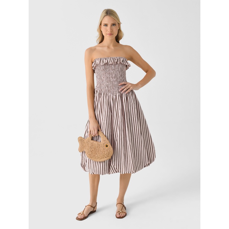 DESCRIPTION:This smocked dress is crafted from soft organic cotton poplin, it features a delicate ruffle detail and a charming bubble hem for a relaxed, effortless silhouette.FEATURES:Strapless NecklineRuffle TrimSmocked BodiceBubble HemMidi SilhouetteAll-