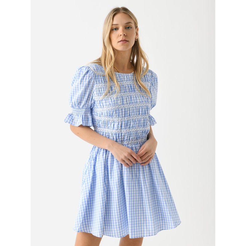 DESCRIPTION:Gingham-printed mini dress with a gathered bodice and fit and flare silhouette.FEATURES:Round NecklinePuff SleevesSmocked BodiceMini SilhouetteAll-Over Gingham Print100% CottonClassic FitModel is wearing size Small dress.Model's Measurements: H
