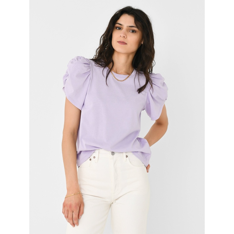 A classic t-shirt silhouette with elevated ruched sleeves.