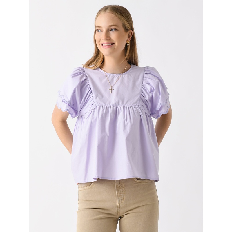 DESCRIPTION:A lightweight cotton top with gathered details and layered sleeves with scalloped trims.FEATURES:Round NecklineBack Keyhole Button ClosureScalloped SleevesGathered Details100% CottonClassic FitModel is wearing size Small top.Model's Measurement