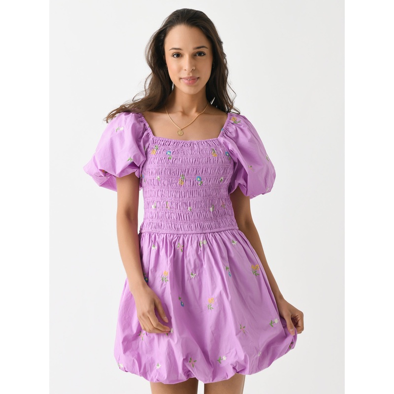 A smocked mini dress with balloon sleeves, a balloon skirt, and an embroidered print.