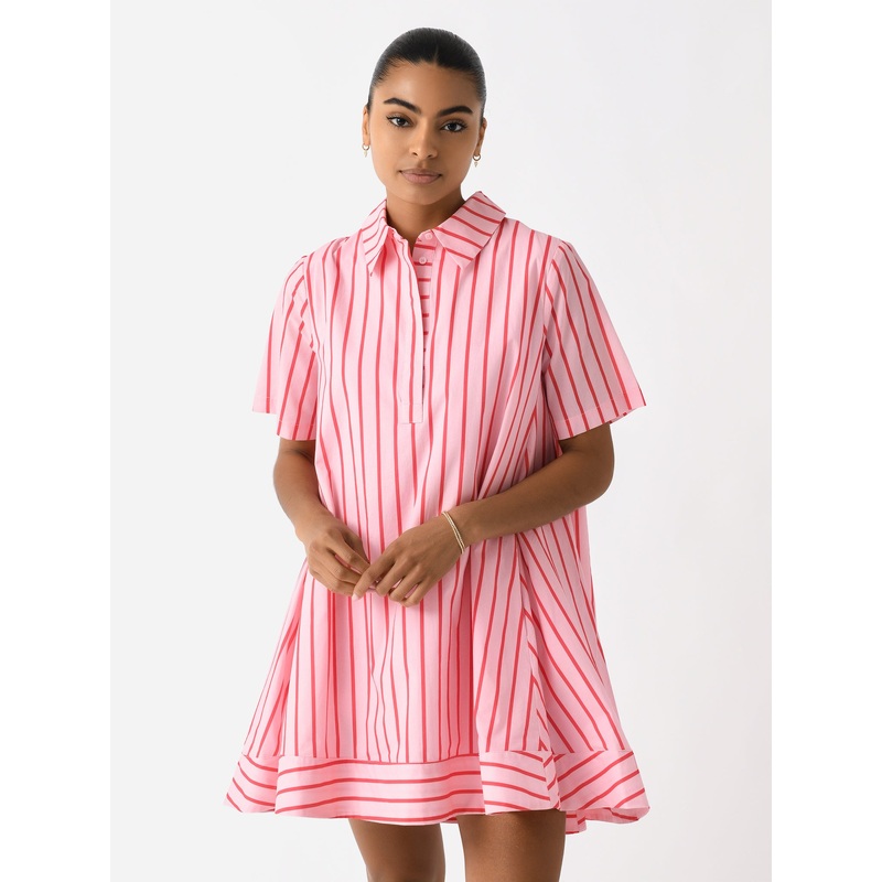 DESCRIPTION:A lightweight cotton shirtdress with a sophisticated design and flattering A-line silhouette.FEATURES:Spread CollarPartial Button PlacketPleated BackMini LengthA-Line SilhouetteAll-Over Stripe Print100% CottonRelaxed FitModel is wearing size Sm