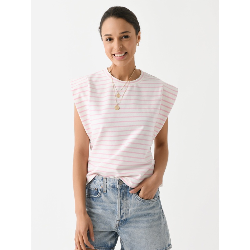 A striped t-shirt made from a soft jersey fabric with a cap sleeve design.