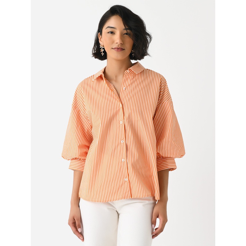 DESCRIPTION:A striped button-down shirt with unique balloon sleeves.FEATURES:Spread CollarDropped ShoulderHalf-Length Balloon SleevesButton CuffsButton-Down PlacketAll-Over Stripe Print100% PolyesterRelaxed FitModel is wearing size Small shirt.Model's Meas