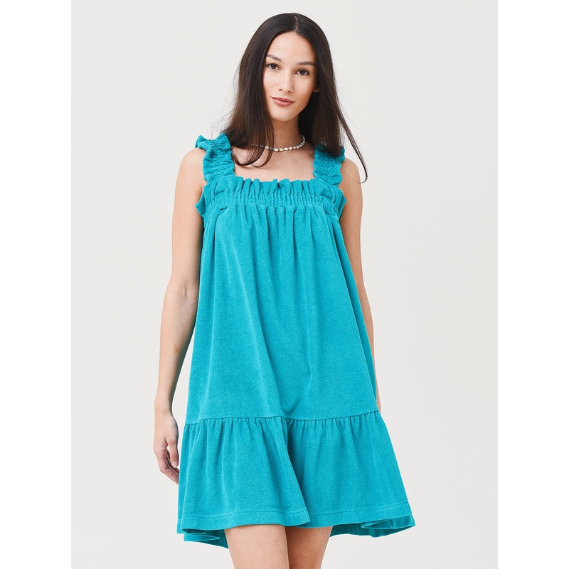 DESCRIPTION:Terry mini dress with ruffle details that can also be used as a swim cover-up.FEATURES:Mini Dress/Cover-UpSquare Neckline with Ruffle DetailSleeveless with Ruffle StrapsTiered SkirtTrapeze SilhouetteQuick-DryingTerry Fabrication100% CottonRelax