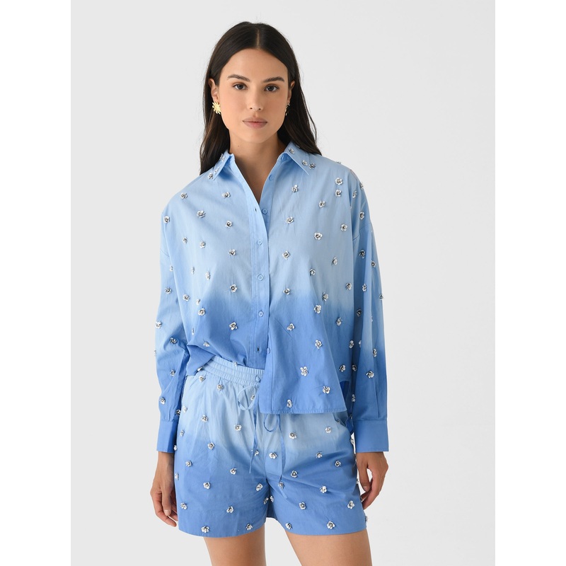 An oversized button-down shirt made from lightweight cotton with an ombre design and bead and rhinestone embellishments.
