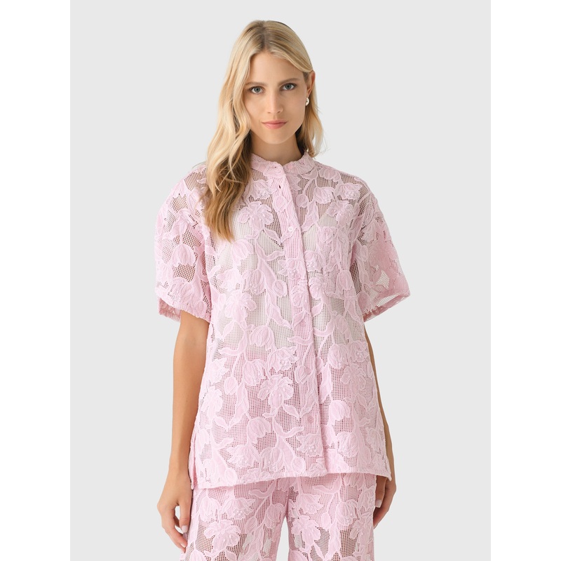 This shirt effortlessly combines relaxed elegance with sophisticated details. Designed for a comfortable oversized fit, it features a distinguished mandarin collar and a sleek button-front closure. Delicate lace-embellished embroideries provide a unique touch of grace.