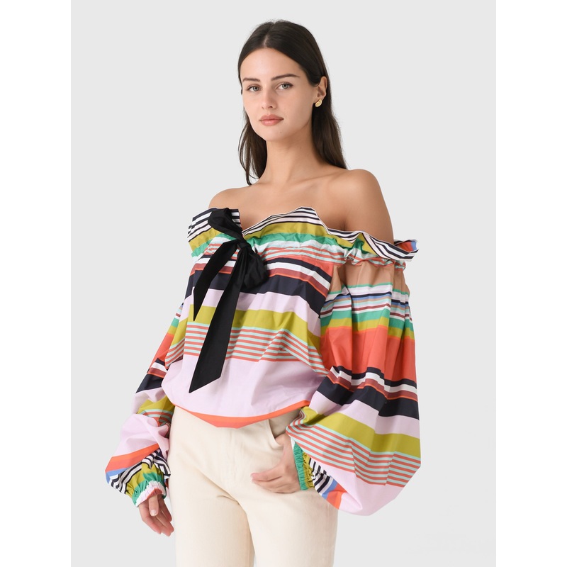 DESCRIPTION:Embrace effortless style in this oversized striped top, crafted from breathable cotton. It features a charming self-fabric tie fastening at the collar and delicate ruffle details that add a playful touch. Voluminous sleeves with elasticated cuf