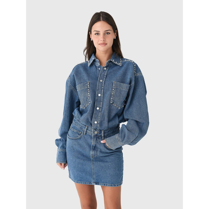 This is a statement denim-on-denim set. The mid-weight shirt is tailored for an oversized silhouette with dropped shoulders and snap buttons. Pearl and stud embellishments trace the chest pockets, collar, and shoulders, adding a touch of elegance. The coordinating mini skirt has a five-pocket construction, belt loops, and a zip-and-button closure for a classic look.