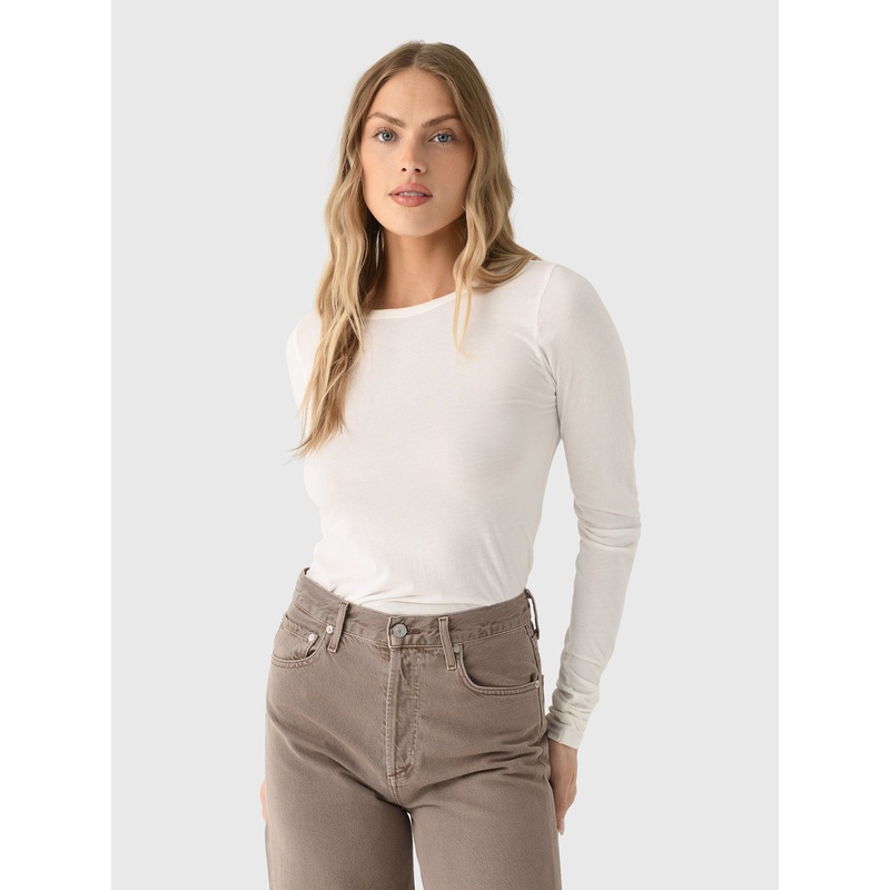 DESCRIPTION:An everyday essential tee made from a soft cotton and modal blend with a slim fit.FEATURES:Crew NecklineLong Sleeves50% Cotton, 50% ModalSlim FitModel is wearing size Small t-shirt.Ivory: Model's Measurements: Height: 5'9.5" | Bust: 34B | Waist