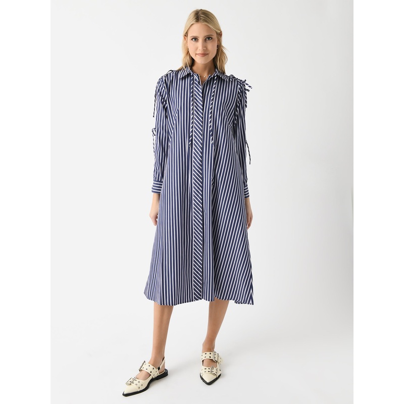A mid-length striped shirt-style dress featuring open sleeves with self-ties and a hidden button placket.