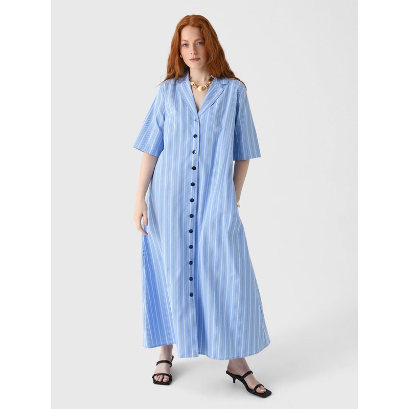 DESCRIPTION:A versatile mid-length striped dress with a button front closure and short sleeves.FEATURES:V-NecklineShort SleevesButton-Down FrontMidi SilhouetteAll-Over Stripe Print100% CottonRelaxed FitModel is wearing size Small dress.Model's Measurements