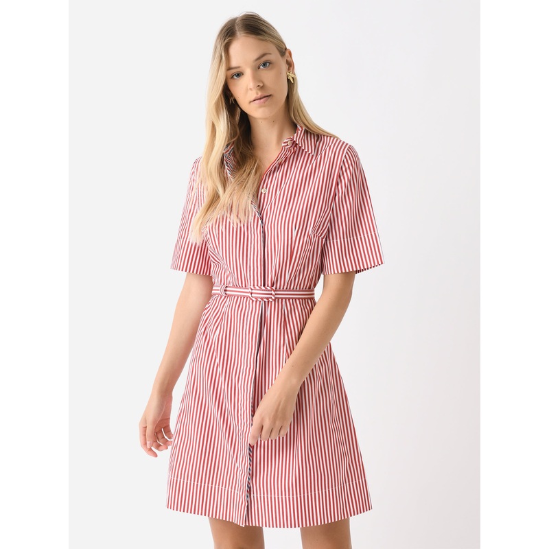 DESCRIPTION:A mini shirtdress made from white and red striped cotton fabric with an adjustable belt.FEATURES:Spread CollarHidden Button-Down FrontAdjustable BeltMini SilhouetteAll-Over Stripe Print100% CottonClassic FitModel is wearing size Small dress.Mod