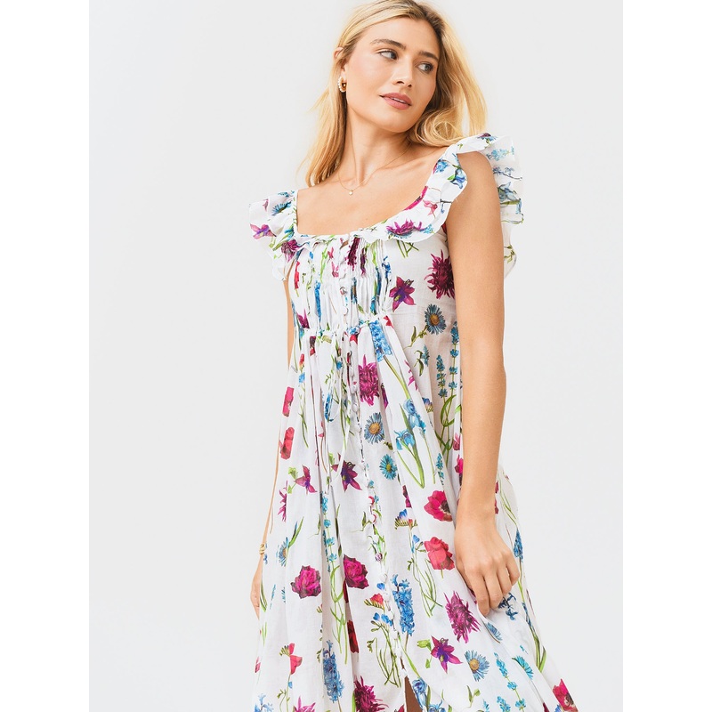 DESCRIPTION:Cotton voile midi dress with a floral print.FEATURES:Midi DressRounded NecklineShort Flutter SleeveFront Pintucked DetailsButton-Down FrontSide PocketsRuffle HemAll-Over Floral PrintLightweight Fabrication100% Cotton VoileClassic FitModel is we