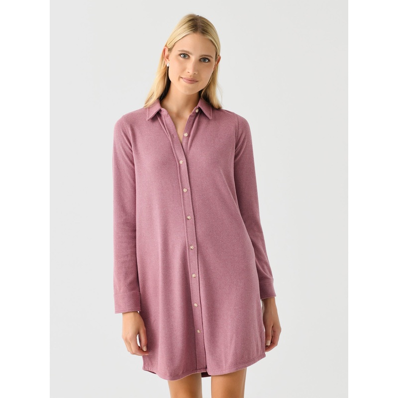 DESCRIPTION:A casual button-down shirt dress made from incredibly soft knit fabric.FEATURES:Spread CollarButton CuffsButton-Down FrontShirttail HemMini SilhouetteKnit Fabrication65% Recycled Polyester, 30% Viscose, 5% ElastaneClassic FitModel is wearing si