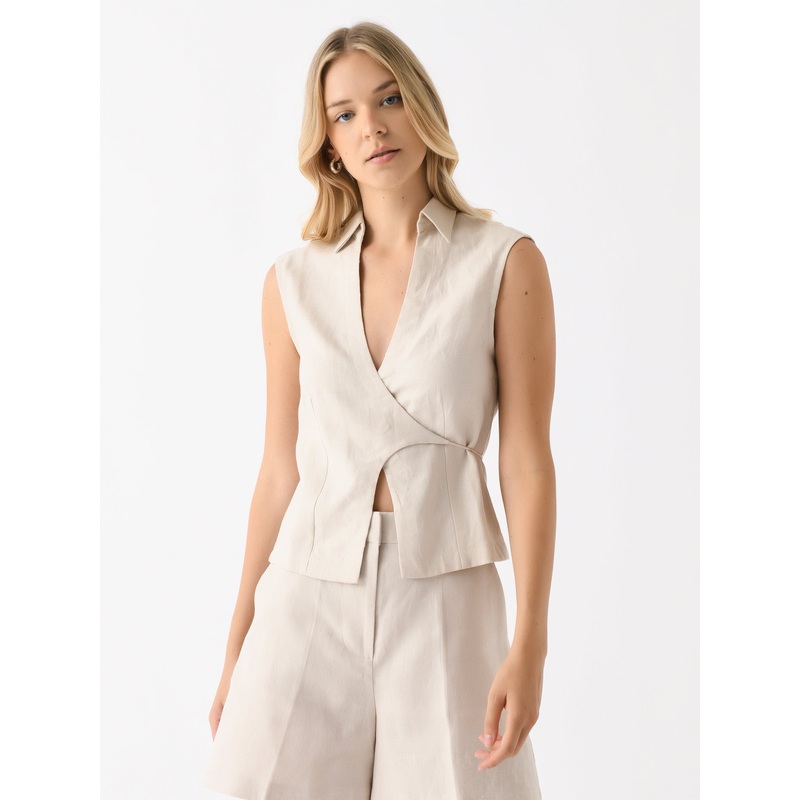 A sleeveless wrap-style shirt made from woven linen with a collard neckline.