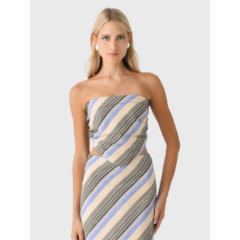 A strapless top featuring a yarn-dyed stripe print with a shirred back and asymmetrical hem.