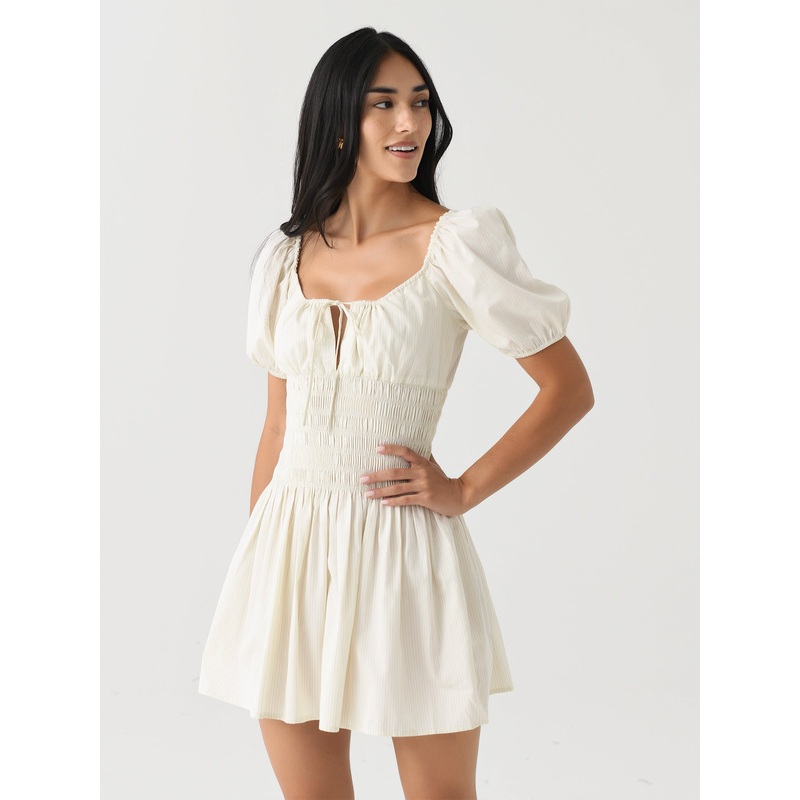 DESCRIPTION:This stylish mini dress is made from soft cotton and features a scoop neckline with adjustable ties to offer comfort and versatility.FEATURES:Self-Tie NecklinePuff SleevesSmocked WaistMini LengthA-Line SilhouetteAll-Over Stripe Print100% Cotton