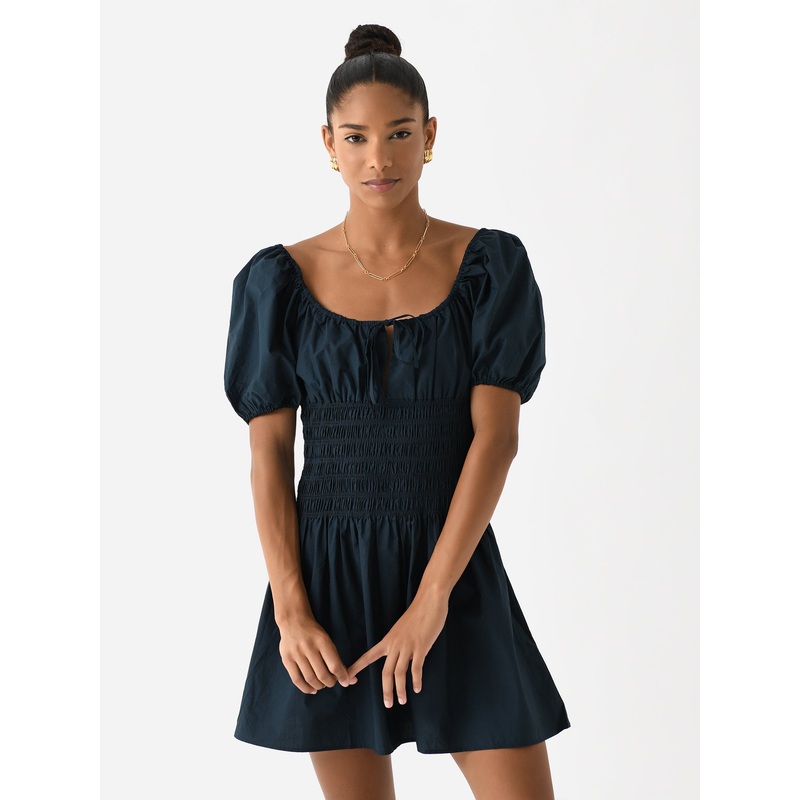 DESCRIPTION:This effortless cotton mini dress boasts a shirred bodice and a breezy A-line skirt.FEATURES:Self-Tie NecklinePuff SleevesSmocked WaistMini LengthA-Line Silhouette100% CottonClassic FitModel is wearing size US4/AU8/S dress.Model's Measurements: