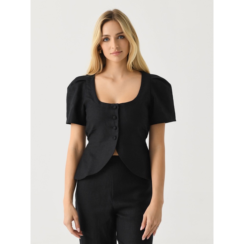 DESCRIPTION:A flattering blouse made from lightweight linen with oversized cap sleeves, self-covered buttons, and a curved hem.FEATURES:Scoop NecklineOversized SleevesButton-Down FrontCurved Hem100% LinenClassic FitModel is wearing size US4/AU8/S vest.Mode
