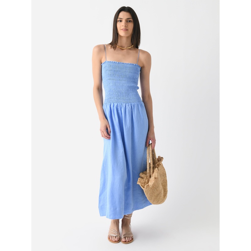 DESCRIPTION:A casual dress constructed from lightweight linen with a shirred bodice and gathered A-line skirt.FEATURES:Square NecklineThin, Adjustable StrapsSmocked BodiceMidi LengthA-Line Silhouette100% LinenClassic FitModel is wearing size US4/AU8/S dres