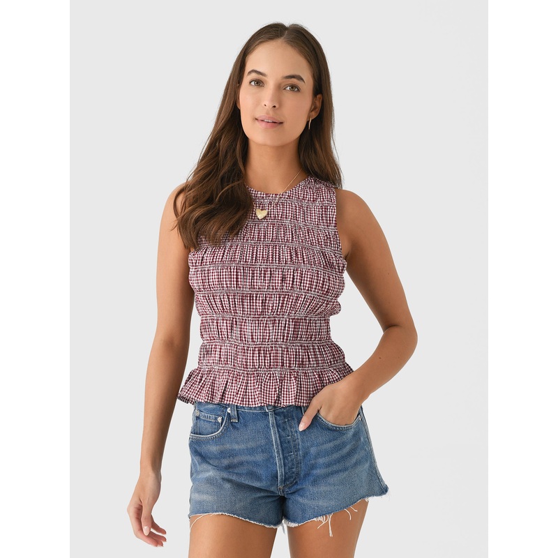DESCRIPTION:A feminine yet effortless blouse made from shirred organic cotton with a small peplum hem.FEATURES:Round NecklineBack Keyhole Button ClosureSleevelessSmocked ConstructionPeplum HemAll-Over Gingham Print100% Organic CottonClassic FitModel is wea
