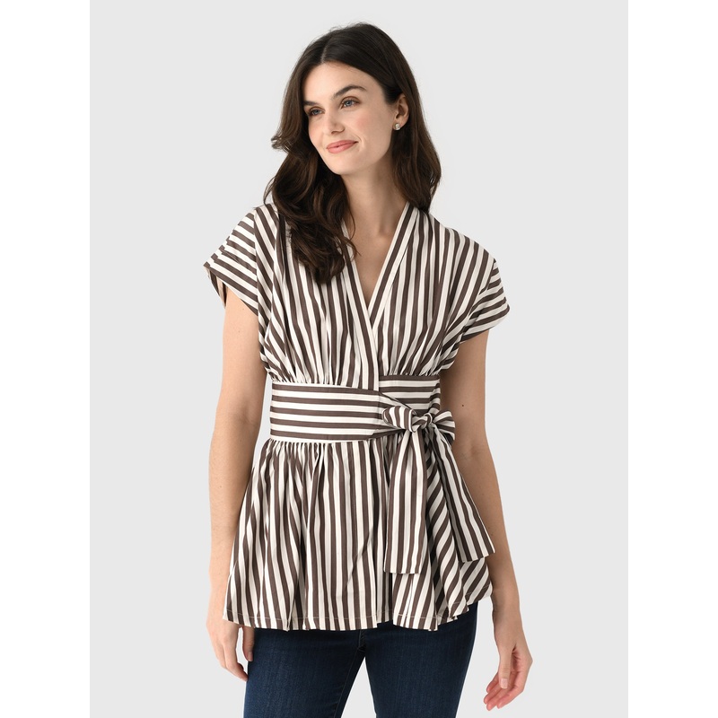 A versatile wrap-style top crafted from organic cotton in a brown and white stripe, inspired by Scandinavian design. It features extended shoulder cap sleeves, a deep V-neckline, and an adjustable wrap waist that creates a flattering, customizable silhouette before flowing into a flared peplum hem.