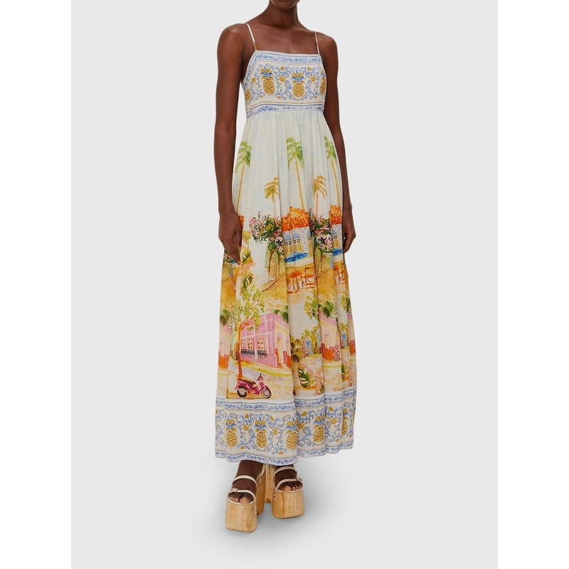 This captivating piece showcases a mesmerizing fusion of playful hues and exquisite nature-inspired patterns, effortlessly capturing the essence of tropical charm. Its beautifully flowing silhouette drapes with grace, while a classic square neckline adds a touch of sophistication.