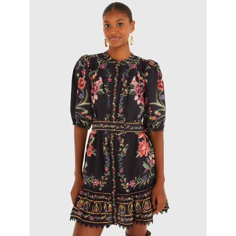 Set against a black background, vibrant florals cascade throughout this dress, with delicate lace trims that add a touch of whimsy. It features a high neckline, gathered puff sleeves, a belted waist, and a playful ruffled hem.