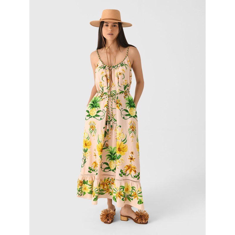 DESCRIPTION:This long and flowy dress is made from a soft linen blend and features rope details and a vibrant floral and pineapple print.FEATURES:Scoop NecklineFixed StrapsSelf-Tie BeltSide PocketsRuffle HemMaxi SilhouetteAll-Over Novelty Print55% Linen, 4