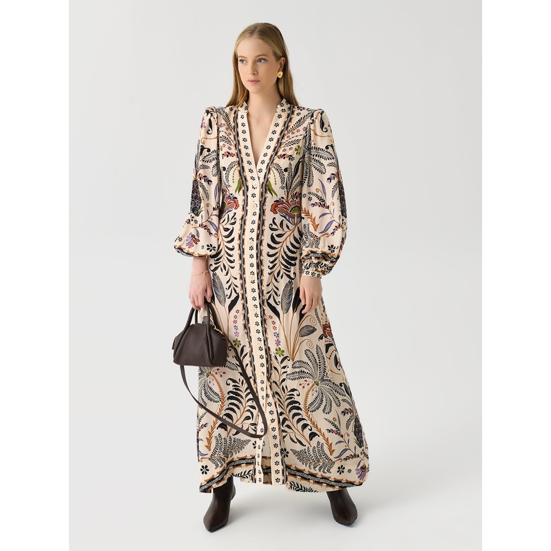 A maxi-length dress featuring voluminous blouson sleeves, a button-down closure, and a custom mixed nature print.