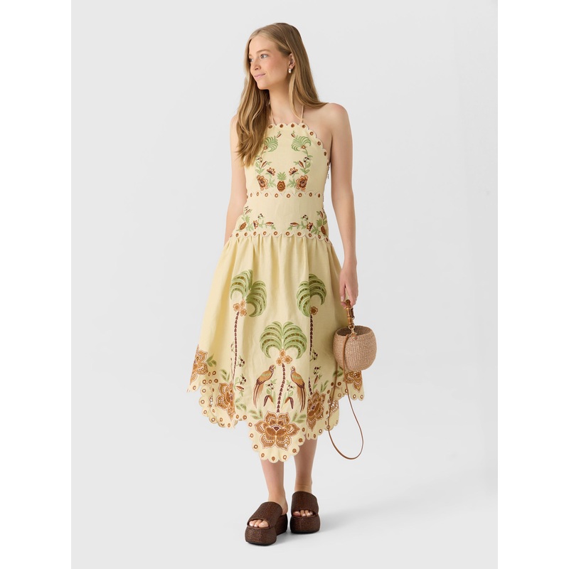 DESCRIPTION:An embroidered apron-style midi dress made from lightweight fabric with an adjustable halter neckline and a gathered skirt that flows into an asymmetrical hem.FEATURES:Halter NecklineBack Button ClosureFitted BodiceGathered SkirtAsymmetrical He