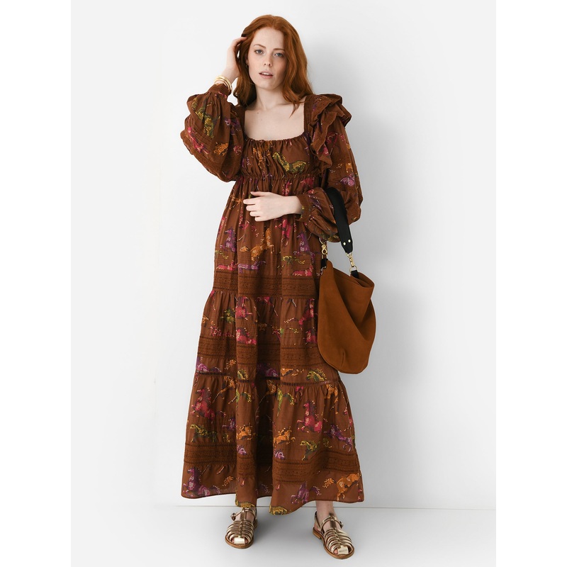 DESCRIPTION:A maxi-length, puff-sleeve dress constructed from a dotted horse print with inset lace detailing throughout.FEATURES:Square NecklineGathered BodiceLayered Shoulder RufflesScoop BackPuff SleevesButton CuffsTiered SkierInset Lace DetailsMaxi Silh