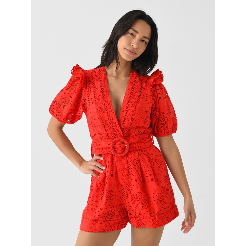 DESCRIPTION:This stunning romper is made from eyelet fabric with romantic puff sleeves and an intricately beaded belt that creates an elegant silhouette perfect for any special occasion.FEATURES:V-NecklineRuffle ShoulderPuff SleevesAdjustable BeltSide Pock