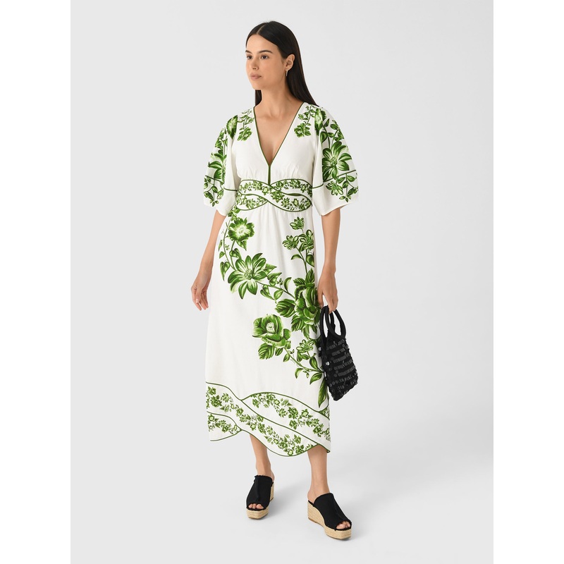 DESCRIPTION:This ivory midi dress presents a fresh, summery aesthetic with its bold green floral print. The dress features a deep neckline and puff sleeves that add a touch of volume. A unique twisted detail at the waist creates a flattering, cinched silho