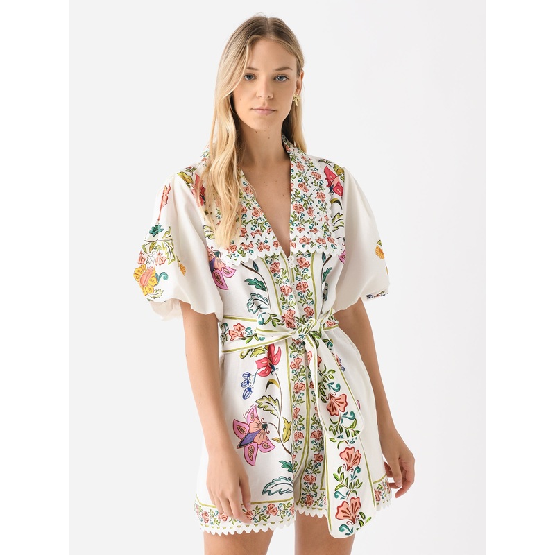 A puff-sleeve romper featuring a large collar, self-tie belt, and colorful floral and butterfly print with scalloped edges.