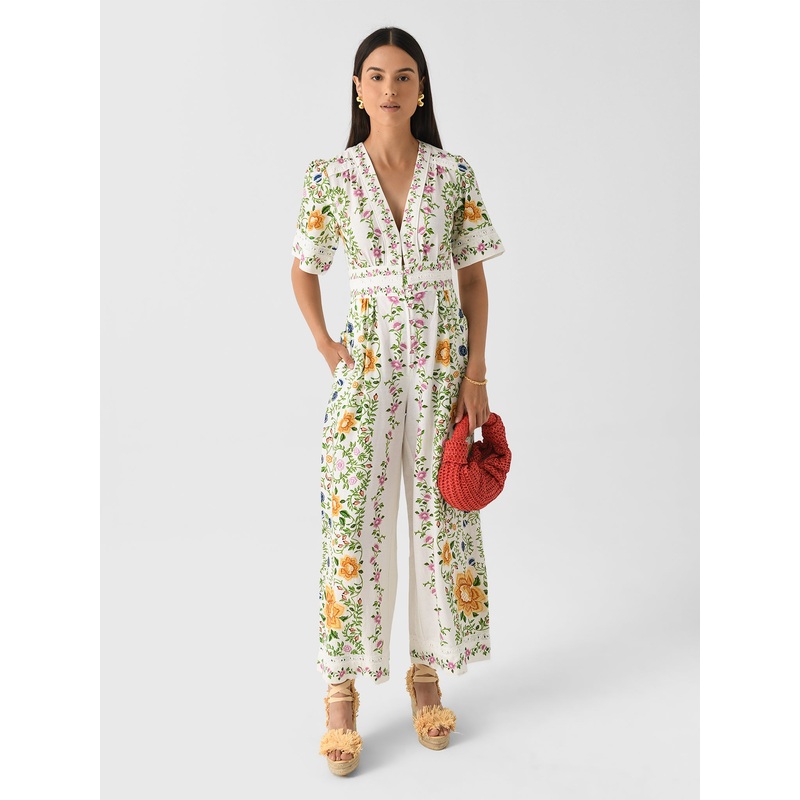 DESCRIPTION:This comfortable jumpsuit features a deep neckline with a relaxed wide-leg design and subtle eyelet embroidered details.FEATURES:V-NecklineBanded WaistButton-Down FrontSide PocketsEyelet EmbroideryWide Leg SilhouetteAll-Over Novelty Print55% Li