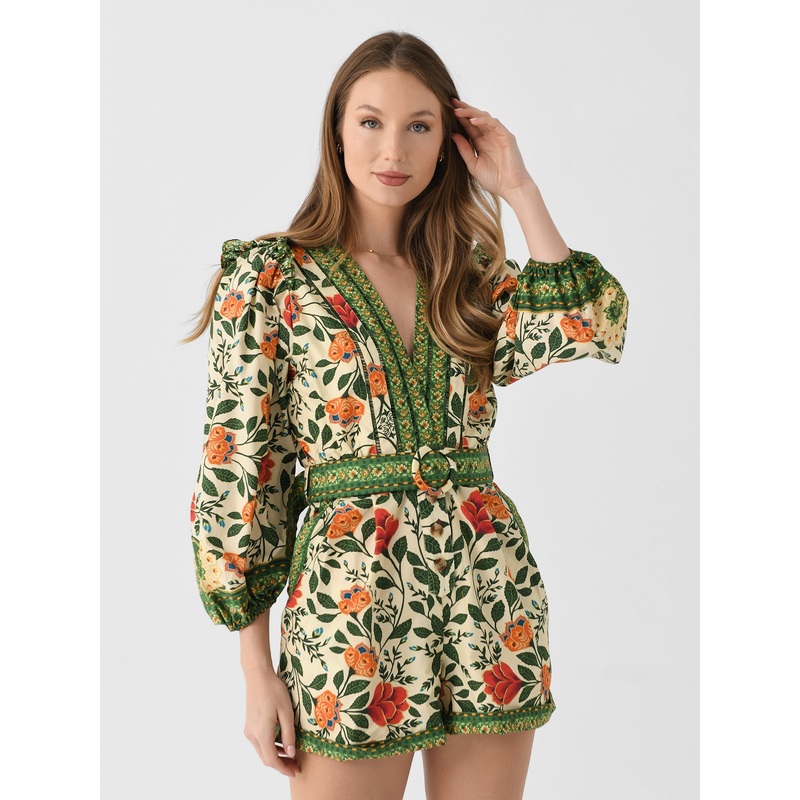 DESCRIPTION:A lightweight, long-sleeve romper made from breathable cotton with a green and cream garden tapestry print.FEATURES:V-NecklineRuffle ShoulderPuff SleevesAdjustable BeltSide PocketsInseam: 3 in.All-Over Novelty Print100% CottonClassic FitModel i